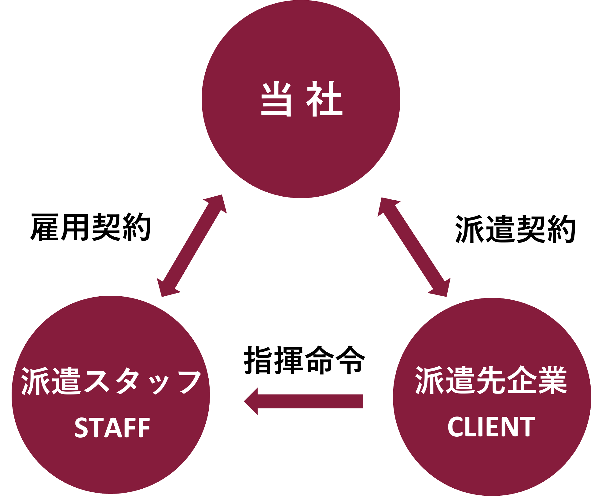 人材派遣のしくみは、派遣スタッフ・派遣先企業・当社の3者の関係で成り立っています。