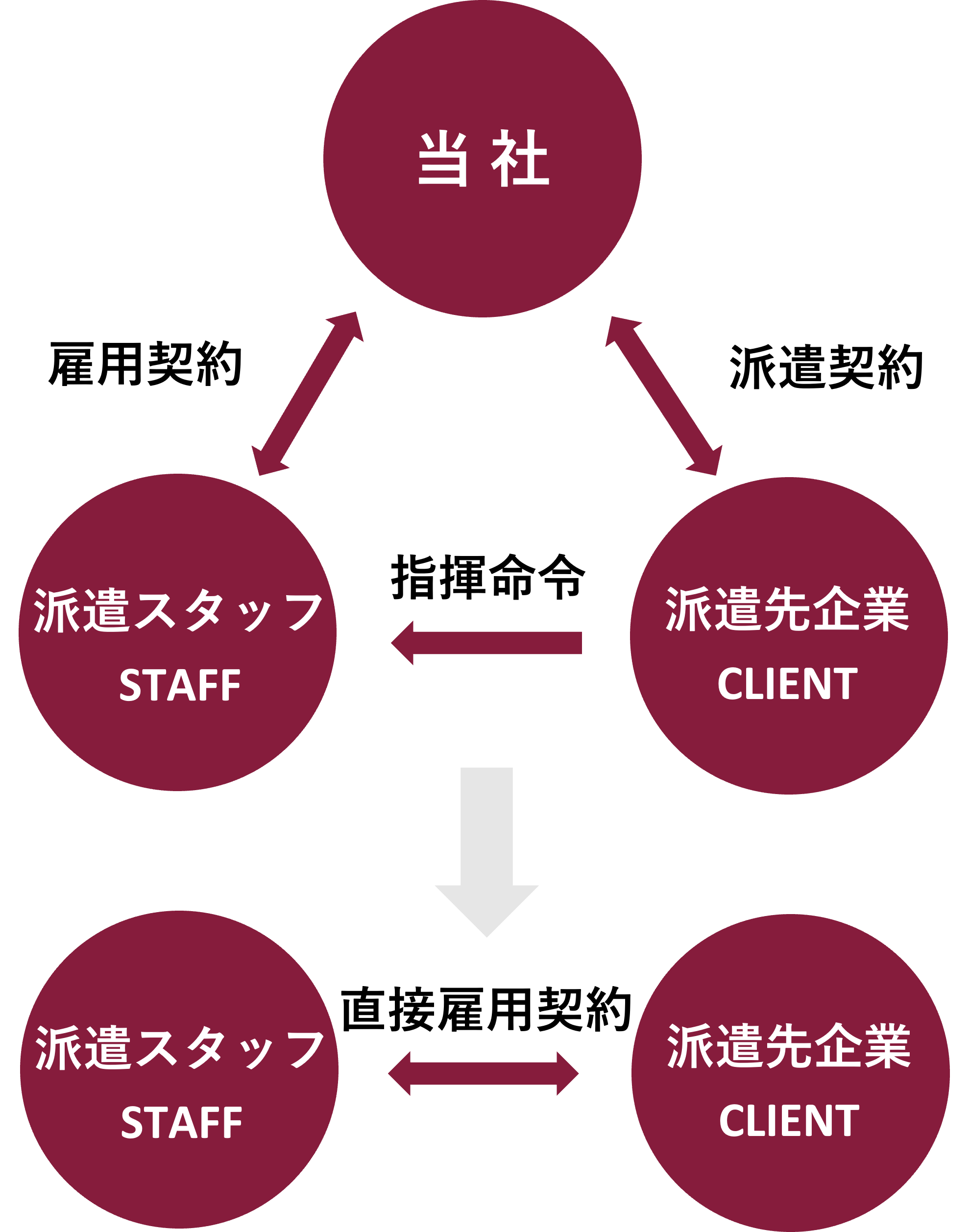 派遣スタッフは、当社と雇用契約を結んだうえで、派遣先企業に派遣され、派遣先企業の指示のもとで仕事に携わります。給与の支払いや社会保険の手続きなどは雇用契約を結ぶ当社が行います。